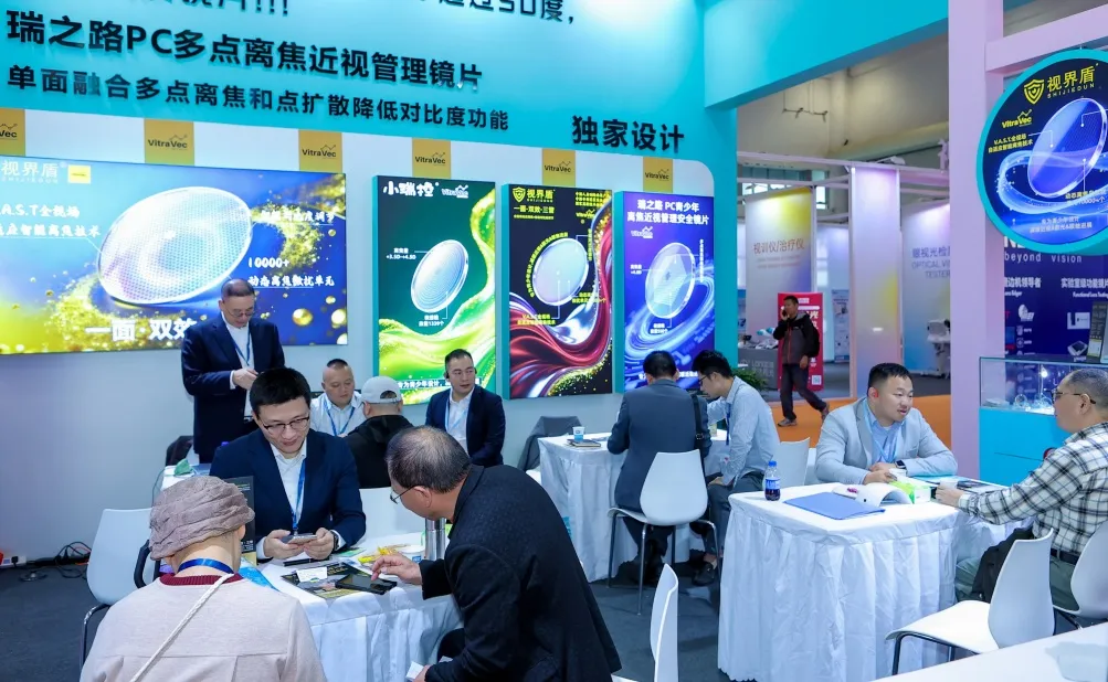 镜片展区则汇聚行业技术力量,依视路、大光明、三普、艾普、澳捷、康耐特、腾诺、虹泰、圣谱、金锐视、旭志、康铭、励杰等知名品牌联袂登场,展示自由曲面个性化定制、青少年近视防控、全视线变色、驾驶偏光等镜片技术,涵盖从日常防护到专业视觉需求的系列解决方案。